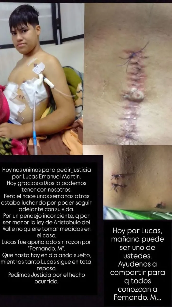 Eva Neves, la mamá de Lucas, dialogó con El Territorio y expuso el calvario que vive su familia, al tiempo que reclamó medidas inmediatas contra el menor. "El 10 de septiembre mi hijo fue a tomar mate a la plaza con un amigo. Como tiene problemas de salud, necesita caminar, andar tranquilo, porque sufre de las piernas y del corazón. Estaban volviendo a casa cuando apareció ese chico del barrio, Fernando, y empezó a increparlo", relató. El ataque que casi le costó la vida de su hijo comenzó con provocaciones verbales, detalló: "Le preguntó que si andaba hablando de él con un señor que vende gas. Mi hijo le dijo: 'Yo no tengo por qué hablar de vos'. Y ahí empezó a molestarlo, a preguntarle la edad. Cuando mi hijo le respondió que él no era la autoridad para preguntarle nada, este chico se enojó más", contó.