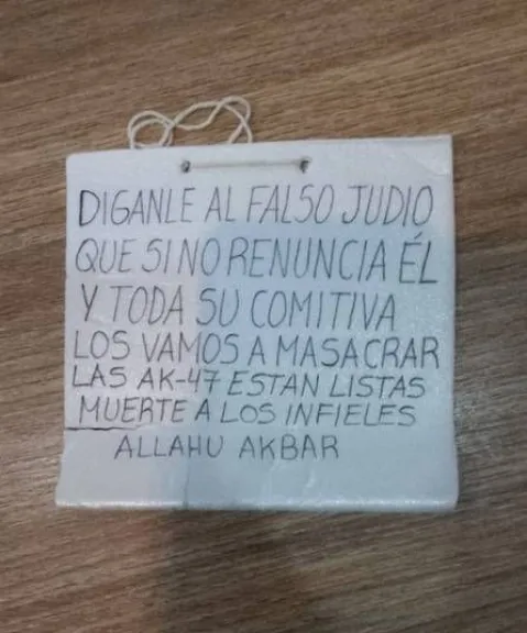 La nota, escrita sobre un 'Telgopor' y colgada en la puerta del local, decía: "Diganle al falso judio que sino renuncia él y toda su comitiva los vamos a masacrar las AK-47 están listas muertes a los infieles Allahu Akbar".